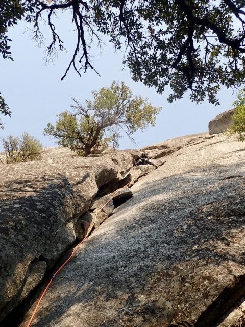 ごちゃごちゃした岩を上がってから取り付き。上のワイド気味のところでザックとカムが挟まってもがいてると水筒を落としてしまい、大反省。(この後、見事に脱水になる)終了は大きなクラックの奥のチョックストーンに、スリングとカラビナの残置あり。このルートではここと 3P 終了点のみ、残置支点があった。