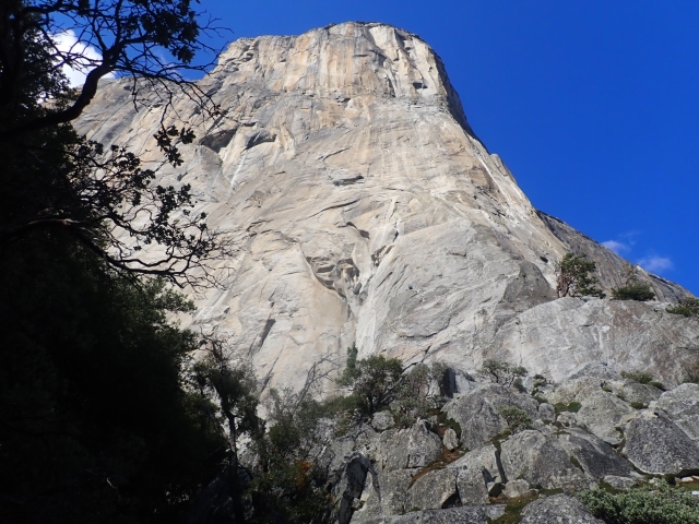ヨセミテ6日目となる日は El キャップベースエリアへ。いつもエルキャピタン見物の観光客で賑わう道路に車を止めて El キャップの取り付きに向かう。巨大な壁がグングン近づいて、一層迫力が増してくる。ノーズを登っているクライマーもすぐそこに見える。