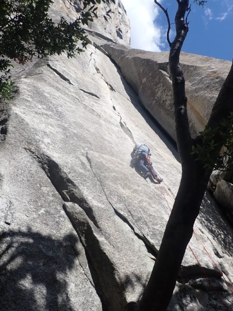 1P だが 60m ロープでは降りられないとのことで、ダブルロープをもって取り付く。下は細いフィンガークラックで難しく、ナッツが役に立った。これを超すとしばらくは快適なハンドサイズで足を置けるところもある。問題はその上のフィストで、やはり足の幅も決まらず難しい、#4 エイドでようやく進むと、上のカブリは見た目よりは手があり思い切って抜けた。