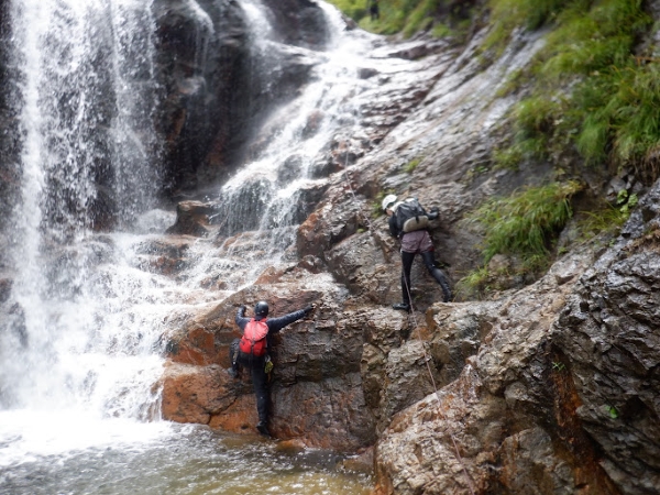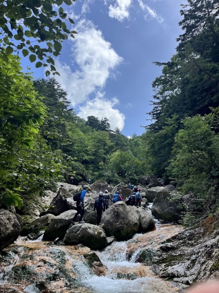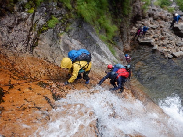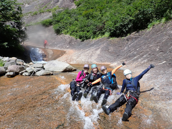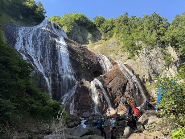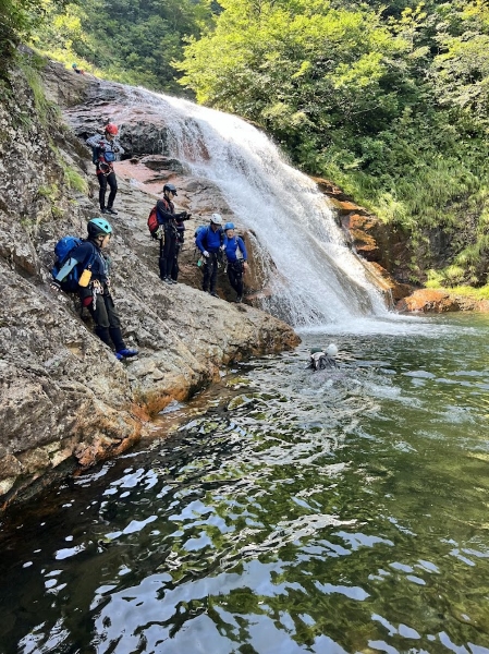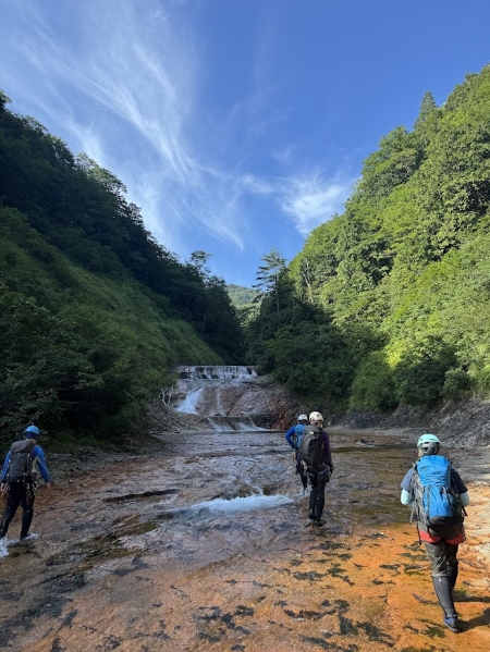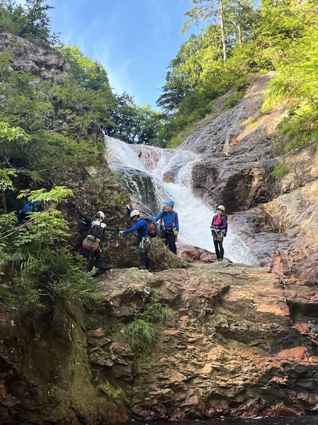 恵まれた仲間と共に、圧巻の大滝やナメ沢に癒され、いくつもの滝をへっぴり腰でのぼり、ロープも手も差し伸べられ、総リーダーは常に後ろから見守ってアドバイスを...。