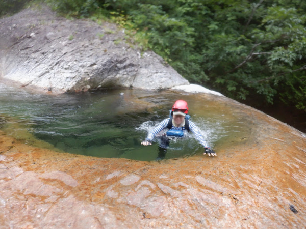沢の淵を通過するために“へつる(壁をトラバースすること)”より私は泳ぐことに。ザックも浮き輪みたいに浮いてくれて怖くなかった。水流が穏やかだったので、進めたのかな(^^)