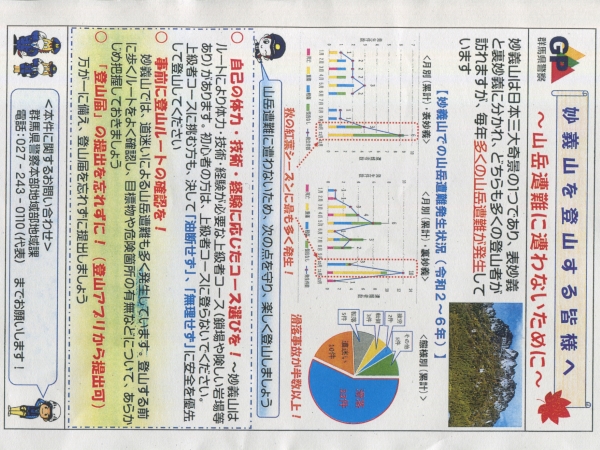 朝、国民宿舎裏妙義Pで所轄署の方々の安全登山の啓蒙活動があり、安全登山ハンドブックやチラシ等を頂いた。チラシには妙義は「紅葉シーズンに最も多く(遭難が)発生」とある。また「山急山は時間が掛かかりますよ」との助言を頂いた。