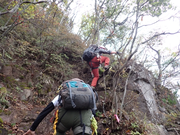 右手に進んで鎖場。チムニーには太い鎖が垂れていて、これを利用して登った。