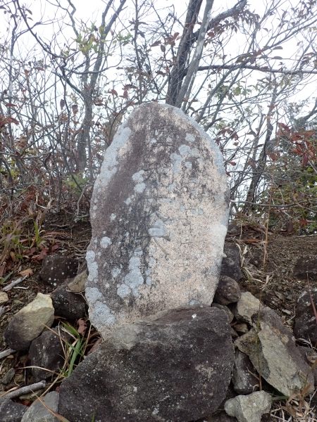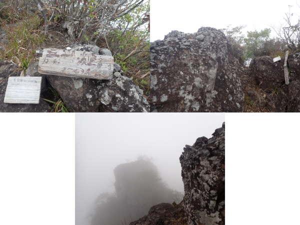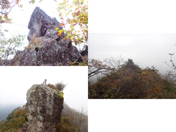 三角点の有る頂稜は藪も手伝いガスで展望が良くはない。葉の落ちた時期が良さそうだ。今回は祠の有る棚道は通らなかったが、五輪岩へ向かう途中で電魔岩に登ってみた。