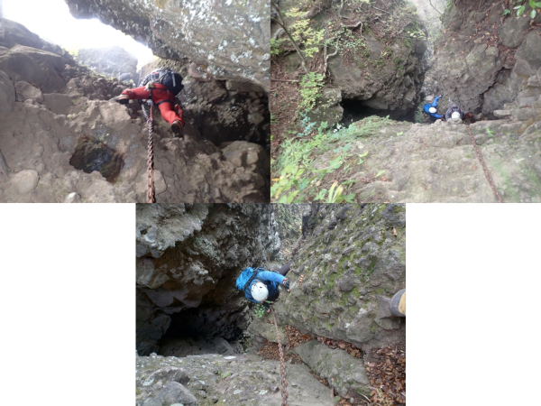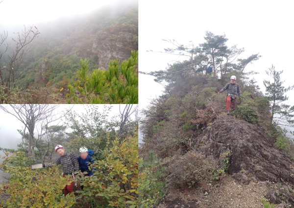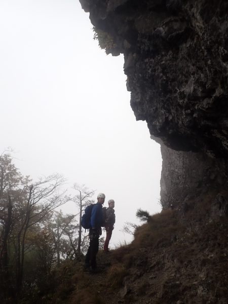 雄岩基部で左手に進むと展望地だがガスで何も見えず。右には薄被りの岩壁、ざっと見る限り残置は無かった。