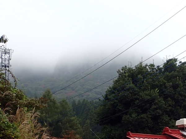 登山口のある恩賀集落は、中山道碓氷峠越えの脇往還、恩賀越えの集落。集落上部の道路から見る高岩は既にガスに覆われていた。
