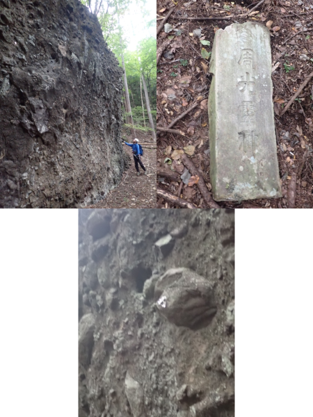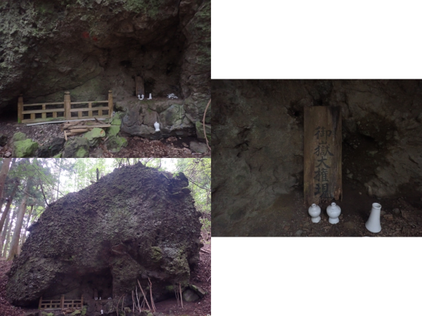 登山道は植林帯を進み、最初の大岩に「御嶽大権現」が祀られていた。倒れている「周光霊神」石碑の脇の、次の大岩にはアンカーが打ってあり2本ルートが作られていた。
