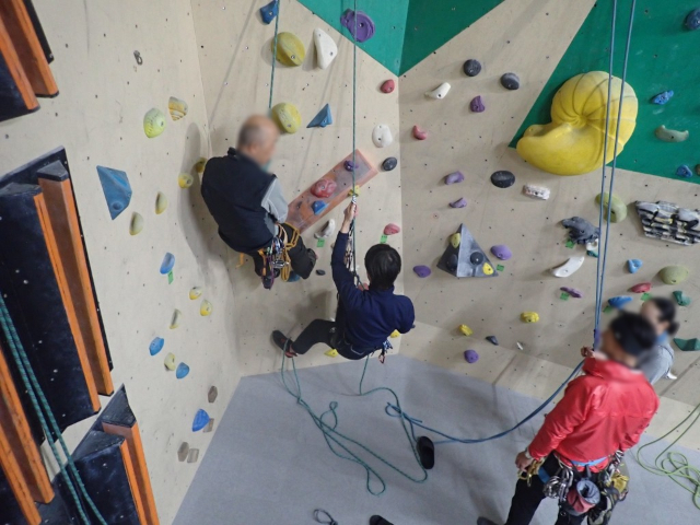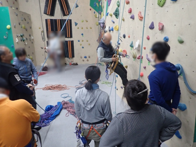 ※この際の注意点として、立ち上がる際はマッシャーを掴まない、ビレイデバイス側のロープは離さないなどがあった。ブレーキシステム付きのビレイデバイスは手を離すことが出来るため少し楽。
