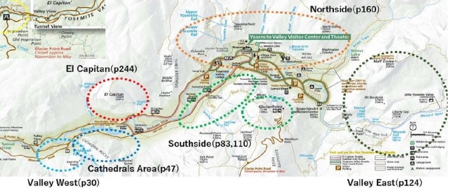 ヨセミテのクライミングエリアは広大で、北の Northside、南の Southside、西の El Capitan, Cathedrals, Valley West、ハーフドームがある東の Valley East に大別される。今回の旅では Northside と El Cap エリアで登った。