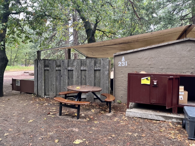 30m 以上ある針葉樹が立ち並び、隣にはマーセド川が流れていて、ハーフドームが見える。ベッドとテーブル、焚火台、熊除けロッカーがあって、寝袋だけ持って行けば泊まれるサイト。