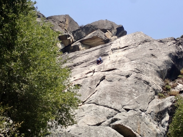 クラックの練習によい、やさしいルート。2p 登ると、この岩場の2階に出てハーフドームがきれいに見える。2階には新しく短いスラブのボルトルートが並んでいた。歩いても下りれるが、2p 目から 60m 1本で2回の懸垂で降りる。1p 目終了の立ち木までにロープが少しだけ足りなかった。