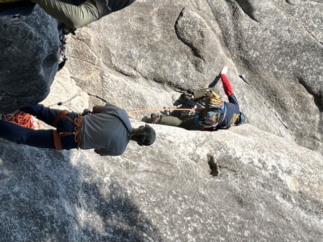 フレーク沿いにスメアで上がっていく。上の大きなフレークには#5があると安心。前のパーティはフレークでピッチを切っていたが、純さんはクラック上に登った後にクライムダウンして懸垂支点で切っていた。 ヨセミテでクラックを登れることに只々感動・・・