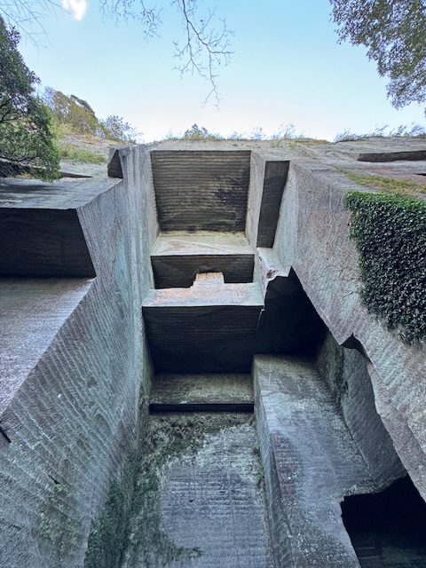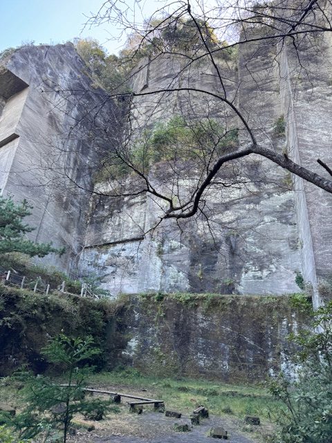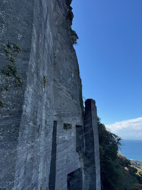 房州石の採掘のために切り下げられ、高さ 100m もある雄大な景色だった。