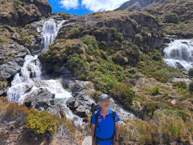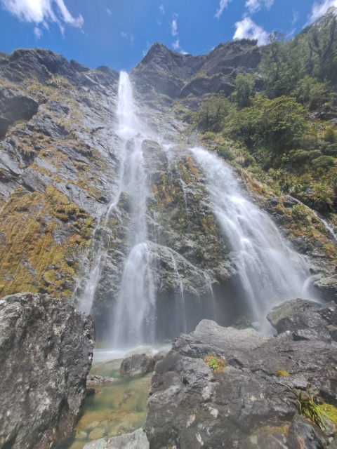 分岐点まで下降してメインルートに戻りしばし行くと、ルートバーン・トラックでは最大級の 174m アーランド・フォールに至る。見上げて見惚れるほどに首が痛い。滝つぼ付近を半周してから、緩やかにアップダウンを繰り返すうちに、マッケンジー小屋に到着した。