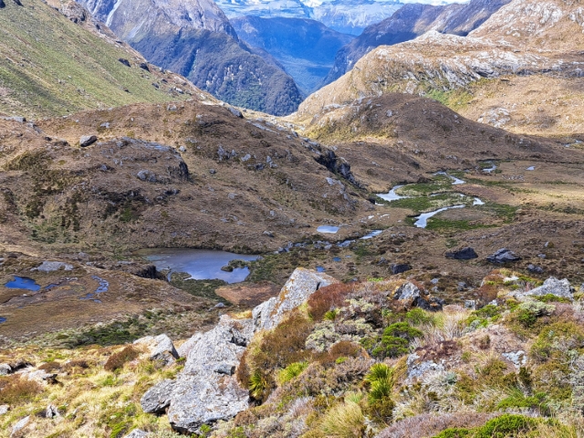 コース最高地点のハリスサドルに着く。往復2時間程度で更なる最高地点のコニカルハット 1814m があるが、お疲れ気味でパス(前々日の 13 時間余の長いフライトが響いたか?)。出発前に作ったサンドウィッチ、リンゴ・アプリコットなどで遅めのランチとして、素直に小屋があるルートバーン・シェルターへ、こちらも素晴らしい景観のなかの下降となった。