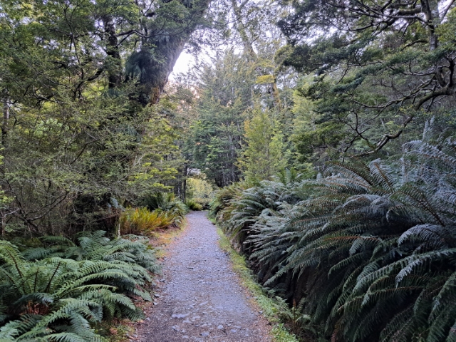 南島観光の拠点 Queenstown から早朝のコーチバスで約3時間、車中ではアメリカ・カリフォルニアからわざわざ来ている母息子のお二人とご一緒しつつ(当方も日本からわざわざ来ているが)、フィヨルドランド地方の中心エリアにあるデバイド(Divide)の登山口で下車し、快晴のなか歩きはじめた。緩やかな登りはシダ林で涼しい、早くも NZ にいる実感ありありのなか、一旦メインルートから右に外れてしばし急坂をいくと、景勝地のキーポイントに至る。