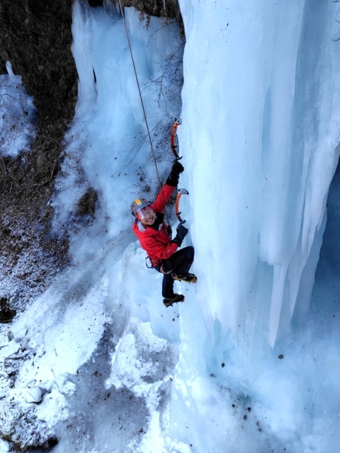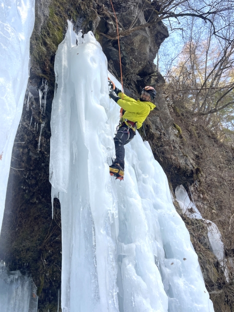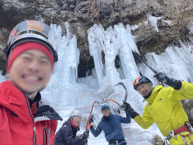 岩とは違いアックス、アイゼンがなかなか決まらず最初は苦戦していたが、慣れてくると笑顔が見える。